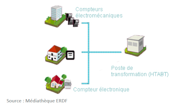 Linky, c’est un compteur nouvelle génération mais aussi une chaîne communicante et un système d’information associé. Ce compteur est capable de recevoir des ordres et de transmettre des informations à distance. Pour cela, il communique avec un concentrateur, sorte de mini-ordinateur intégré la plupart du temps aux postes de transformation gérés par ERDF. Le concentrateur est relié au centre de supervision d’ERDF.