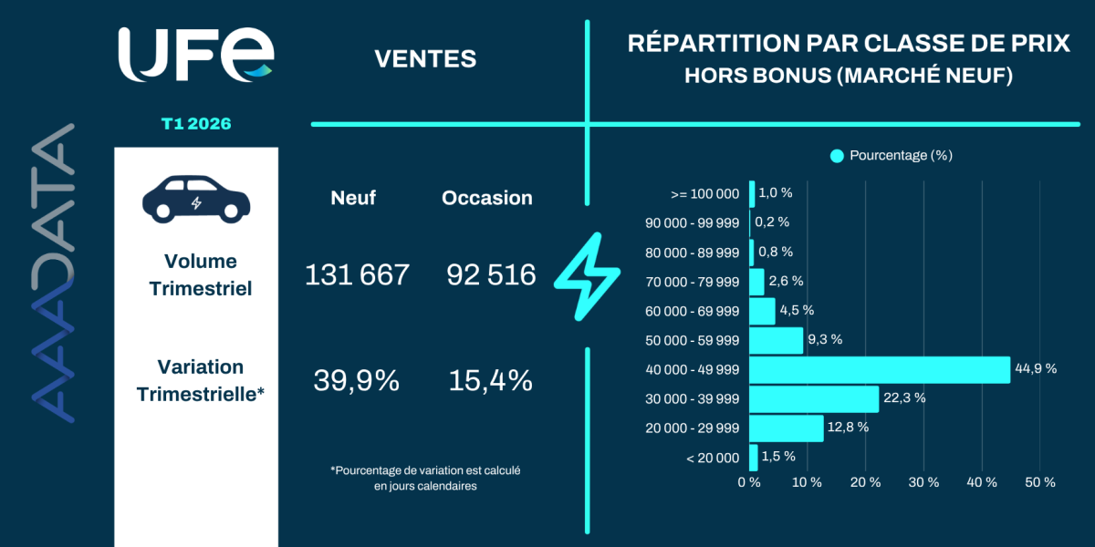 Au premier trimestre 2026, les ventes de voitures électriques neuves augmentent de 40 % par rapport au premier trimestre 2025. Sur le marché de l’occasion, la progression est plus modérée (+15 %), mais l’écart continue de se réduire avec le neuf, avec 92 500 véhicules vendus contre 131 667. Sur les segments des véhicules utilitaires légers et des véhicules industriels, la variation trimestrielle est de +36 % par rapport au premier trimestre 2025.