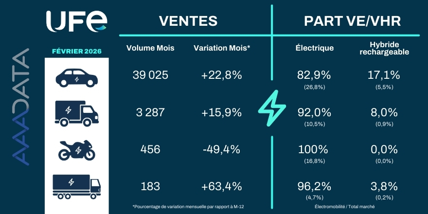 En février les ventes de véhicules 100 % électriques restent solides et atteignent près de 27 % de part de marché. En incluant les véhicules hybrides rechargeables, les immatriculations de véhicules électrifiés sont en hausse de 4 000 unités par rapport au mois dernier. Alors que ces derniers mois cette dynamique était portée par les particuliers, l’électrification des flottes représente désormais 58 % des achats. Enfin, Tesla remplace Citroën sur la troisième marche du podium des constructeurs, derrière Renault et Peugeot.