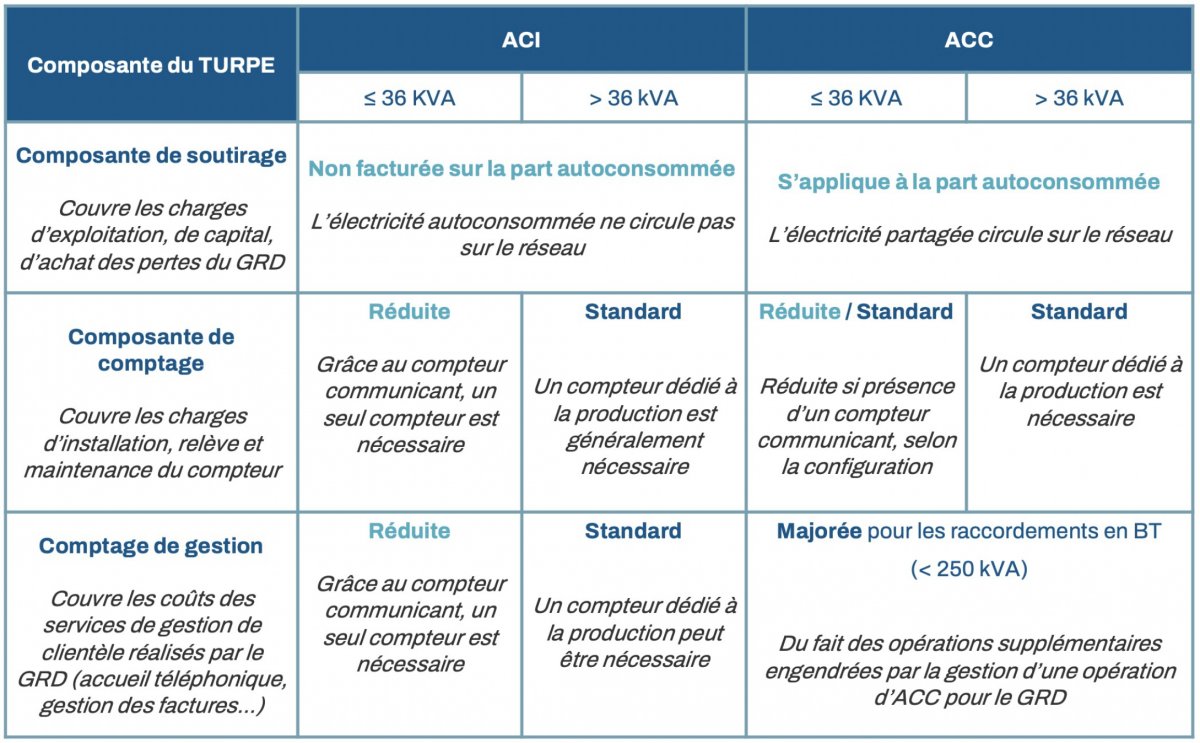 En ACI ou ACC, le Tarif d’Utilisation des Réseaux Publics d’Électricité (TURPE [25]) est ajusté pour tenir compte des particularités de soutirage, de comptage et de gestion. Pour une ACI, l’autoconsommation permet d’éviter les coûts d’acheminement du TURPE sur la part autoconsommée. En revanche dans le cas d’une opération d’ACC, l’électricité autoconsommée transite par le réseau, ce qui justifie la facturation du TURPE sur la part autoconsommée.